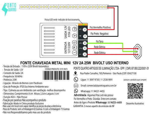 Observação geral: Pode ser ligado no máximo 2 rolos (10 metros) seguidos, após isso deve ser puxado outra ligação a partir da fonte, respeitando a alimentação máxima de cada fonte.GARANTIA